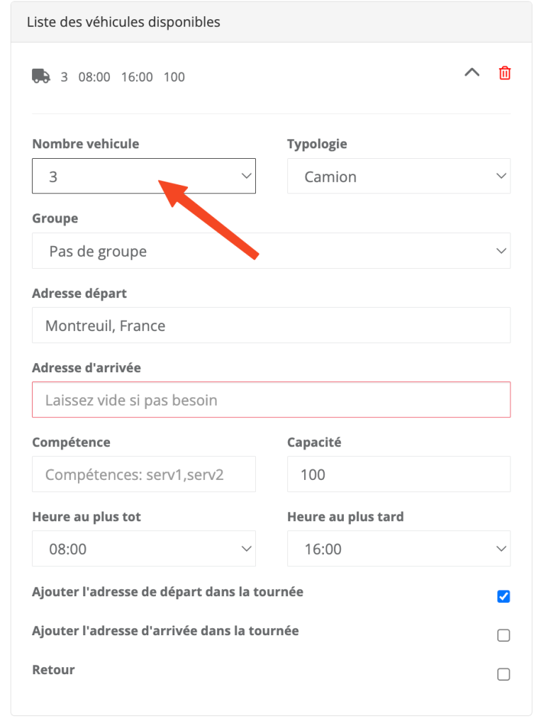 Pour calculer l’itinéraire optimal, indiquez simplement le nombre de véhicules à votre disposition ainsi que leur capacité.
